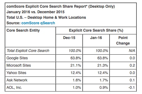 Secondo i dati di comScore, le ricerche da desktop nel gennaio 2016 in USA vedono Google in testa al 63.8 per cento; seguono Microsoft con il 21.3 per cento e Yahoo al 12.4 per cento. Se Google acquistasse Yahoo, potrebbe portare la sua quota di mercato al 76.2 per cento. Ricordiamo però che al momento Yahoo ha stretto un accordo con Microsoft e l’acquisizione di Google potrebbe complicare se non sciogliere del tutto questa collaborazione. La scadenza del primo giro di offerte per comprare i servizi di Yahoo scade il prossimo 18 aprile; vedremo chi parteciperà.