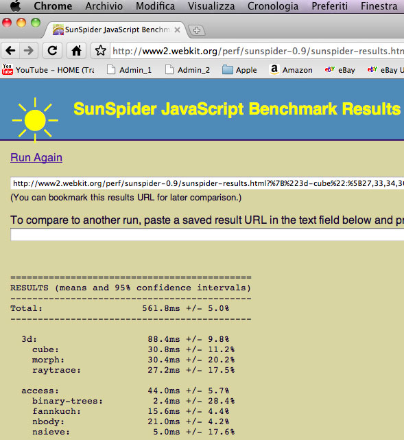 Per confermare le impressioni iniziali abbiamo eseguito due giri di prove con il test SunSpider che misura la velocità  di esecuzione dei browser per il codice JavaScript. Per entrambe le sessioni Safari è risultato il browser più veloce nel gestire JavaScript (496,8 millisecondi e 485,2 millisecondi) seguito a breve distanza da Chrome in beta per Mac (561,8 millisecondi e 569 millisecondi) mentre dal confronto Firefox rimane sempre in terza posizione a lunga distanza dai primi due (3016,8 millisecondi e 2941 millisecondi). Anche se SunSpider calcola la velocità  esclusivamente per il codice JavaScript il test prende in esame diverse istruzioni e controlli che vengono ampiamente utilizzati per la creazione delle pagine Web più complesse, offrendo così un indice piuttosto fedele delle prestazioni complessive di un browser.