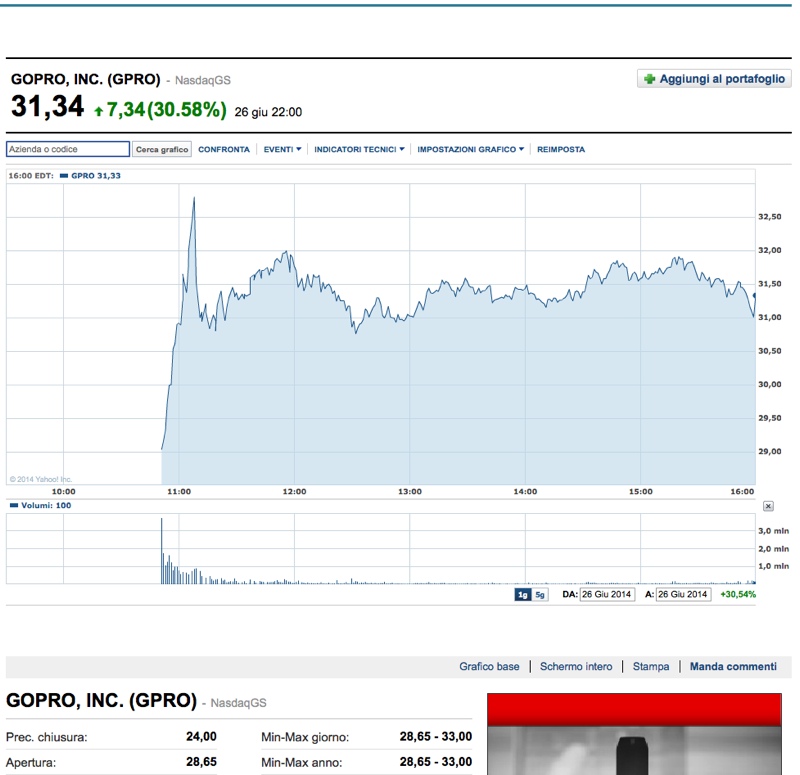 L’offerta pubblica iniziale di GoPro è stata un successo: la società della California celebre per le videocamere d’azione resistenti e indistruttibili, perfette per le riprese in sport e attività estremi, ha visto valutare le proprie azioni a 24 dollari, il prezzo più elevato previsto dagli analisti in un range indicato di 21-24 dollari. Non solo: le quotazioni sono aumentate ulteriormente fino a toccare il prezzo di ben 32 dollari per titolo, per poi ridiscendere leggermente.