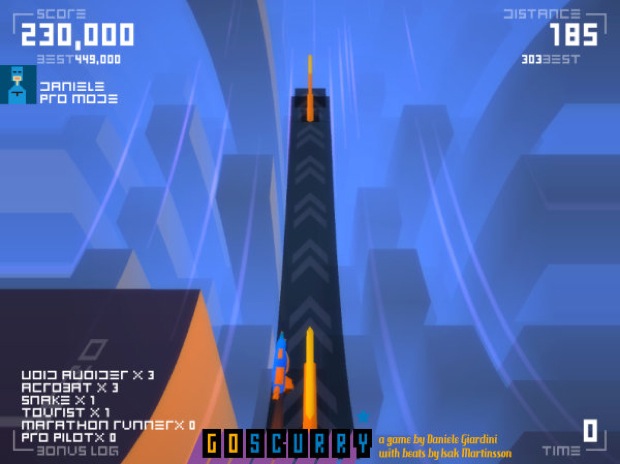 Realizzato con Unity dallo sviluppatore indipendente Daniele Giardini e dalla sua etichetta Holoville Games, Goscurry è un originale e psichedelico endless game per Mac, Windows e Linux. Nel gioco si guida un bolide lungo un percorso che prende forma davanti ai nostri occhi man mano che si avanza sulla pista. L’obiettivo è quello di usare le frecce direzionali per saltare o schivare gli ostacoli, e soprattutto per effettuare curve di 90 gradi con precisione assoluta: basta anticipare o ritardare anche solo di un istante e la vettura finisce inevitabilmente per precipitare. In qualsiasi momento il giocatore è in grado di accelerare e aumentare così il moltiplicatore di punteggio, ma ovviamente rendendo tutto ancora più difficile da seguire. L’azione è accompagnata dall’ottima colonna sonora composta da Isak Martinsson.