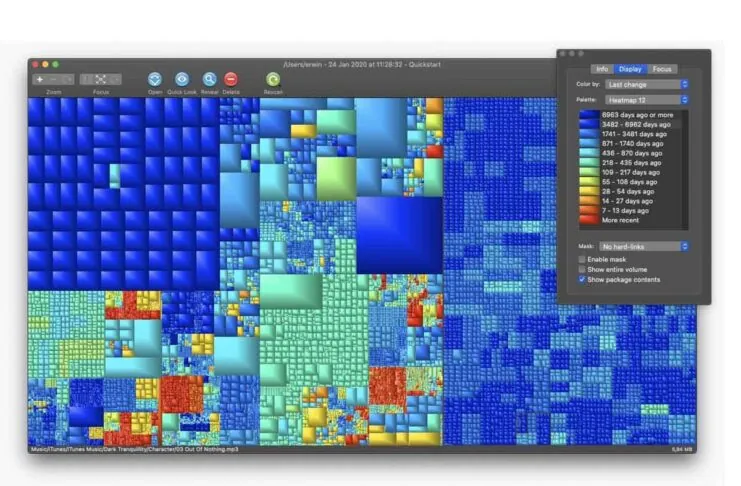 L’utility in questione è comoda quando si ha poco spazio di storage a disposizione e non si comprende bene quali sono i file di grandi dimensioni che occupano spazio. I nomi dei file sono visualizzabili al passaggio con il mouse/track in fondo alla finestra dell’utility e da qui è possibile aprire il percorso nel Finder ed eventualmente aprirli o cancellarli.