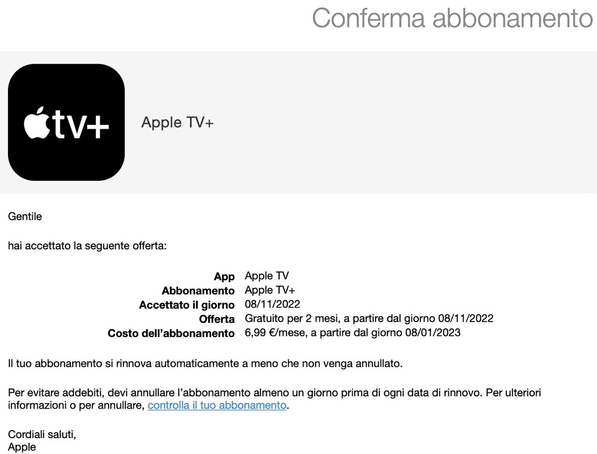 Chi è già stato abbonato, ma non lo è più, riceve così una settimana gratis di prova standard di Apple TV+, più due mesi di abbonamento gratis e, alla scadenza, il pagamento di 6,99 euro al mese per chi decide di rimanere abbonato. Nulla vieta infatti di disdire l’abbonamento prima che parta il primo pagamento.