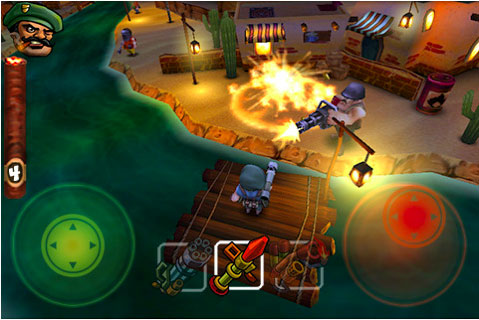 Innanzitutto invece di uno scenario unico dovremo condurre l’intrepido attraverso una serie di livelli diversi molto ben realizzati. Combattimenti in città , deserti, canyon ma anche alcune sequenze speciali dove il nostro dovrà vedersela con i nemici a terra mentre naviga su di una zattera, oppure alla guida di una poderosa ruspa. In ogni scenario è possibile apprezzare la cura per grafica e realizzazione da parte di Chillingo.