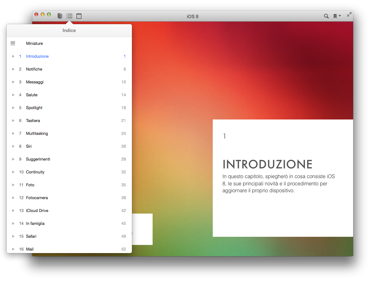 Si tratta di una rapida lettura per chi conosce già il precedente iOS 7, rivelandosi particolarmente utile anche per chi acquista un iPhone, un iPod touch o un iPad per la prima volta: il libro infatti risulta decisamente scorrevole, informando semplicemente sui cambiamenti e le novità introdotte, ma con la possibilità di approfondire il discorso o conoscere il significato e le caratteristiche di parole e funzioni specifiche grazie alle finestre a comparsa attivabili premendo sopra i termini del glossario in grassetto.