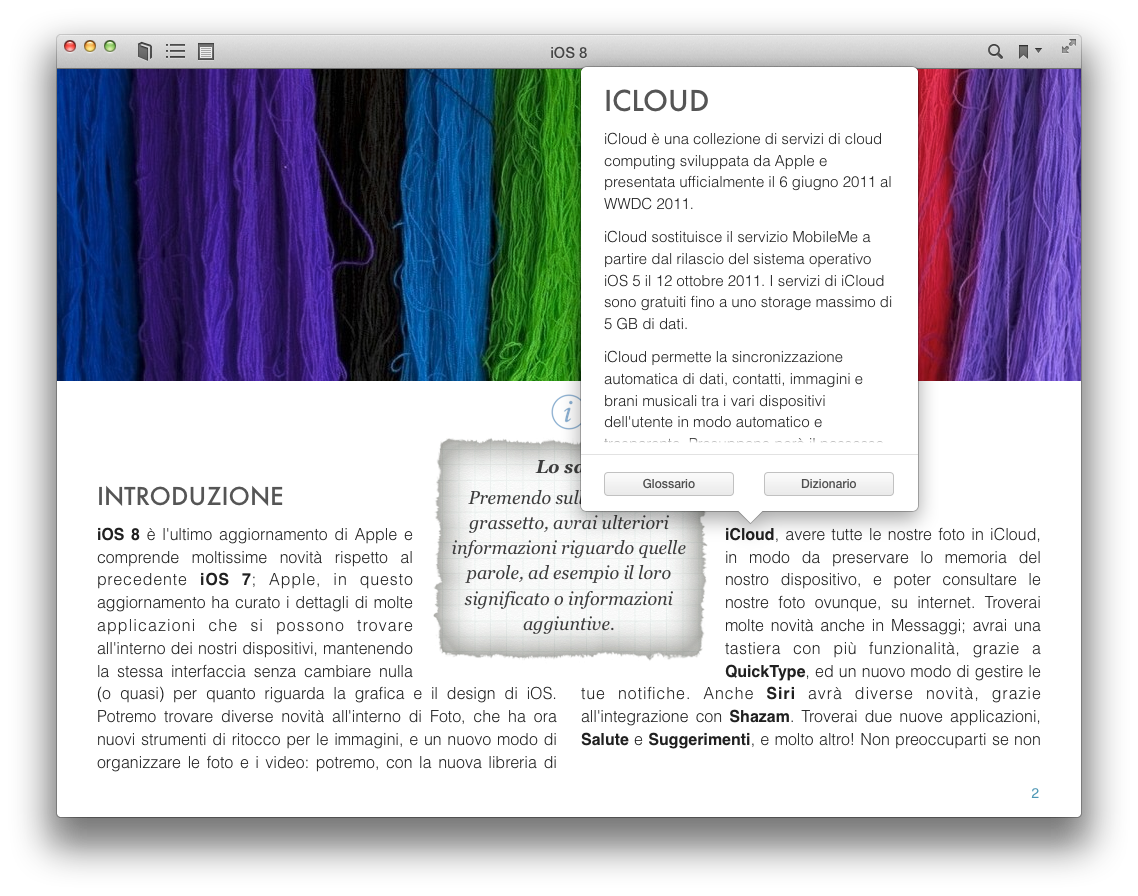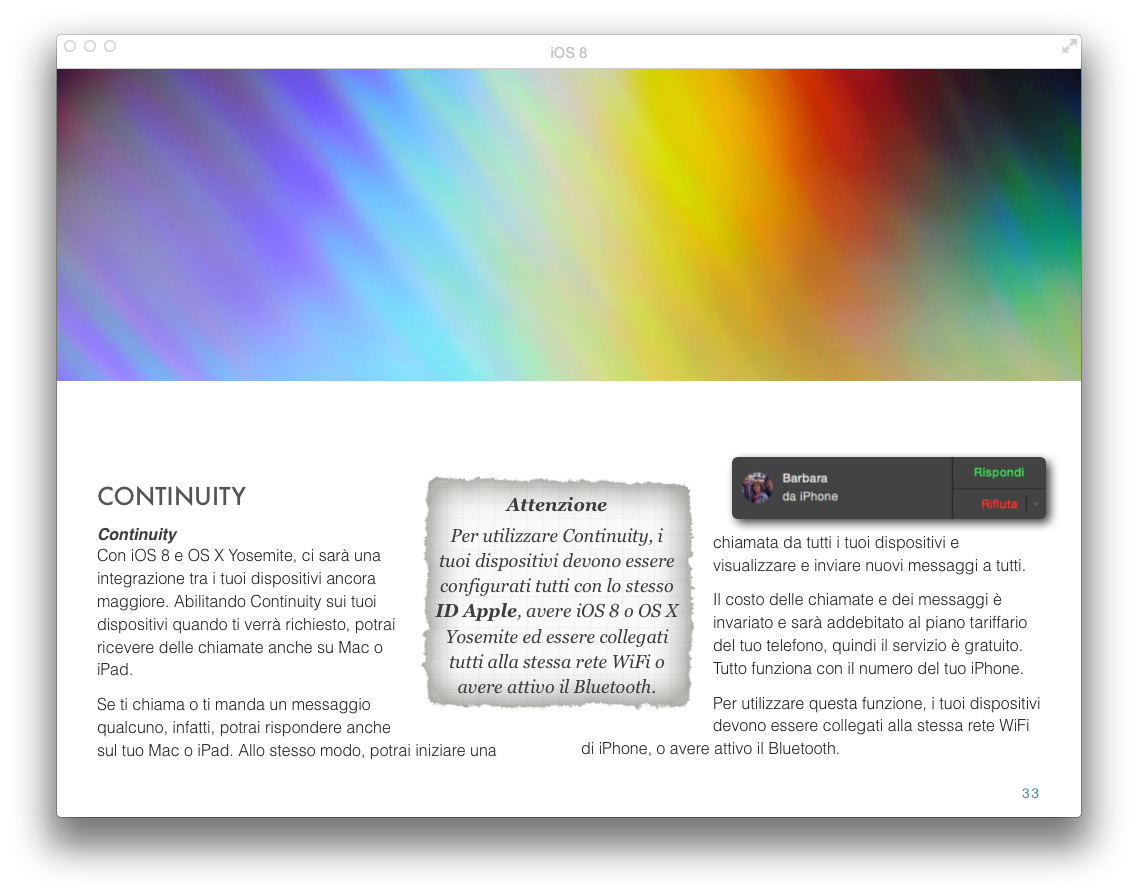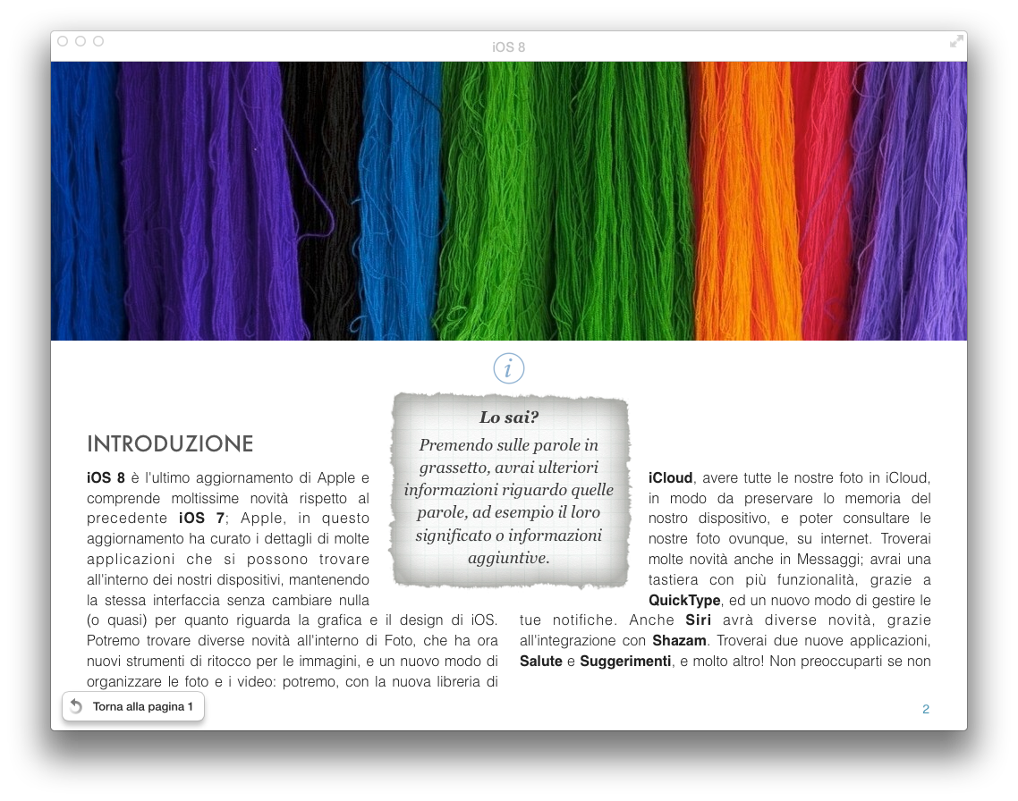 La guida di iOS 8 è su iBooks Store. Disponibile per iPad e Mac, si tratta di un completo libro che analizza, una per una, tutte le novità introdotte sul nuovo sistema operativo mobile di Apple con tanto di immagini descrittive e dettagli su funzioni ed utilizzo pratico per ciascuna.