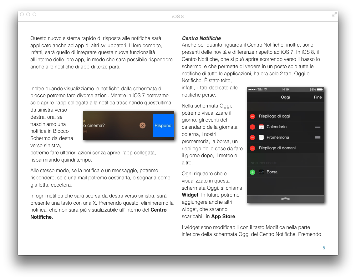 Per un totale di 59 pagine, l’ebook edito da Alessandro Schiattone introduce la lettura enunciando le principali novità che il nuovo iOS 8 porta con sé, spiegando i vari metodi per aggiornare il proprio dispositivo e cominciando ad analizzare il nuovo sistema di notifica. Nulla di quanto è già stato possibile scoprire dalla WWDC del 2 giugno fino all’ultima beta viene dimenticato, descrivendo il nuovo sistema di Widget, il Centro Notifiche ed il nuovo iMessage.