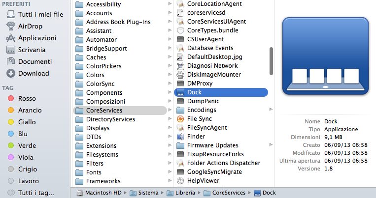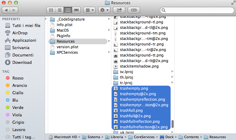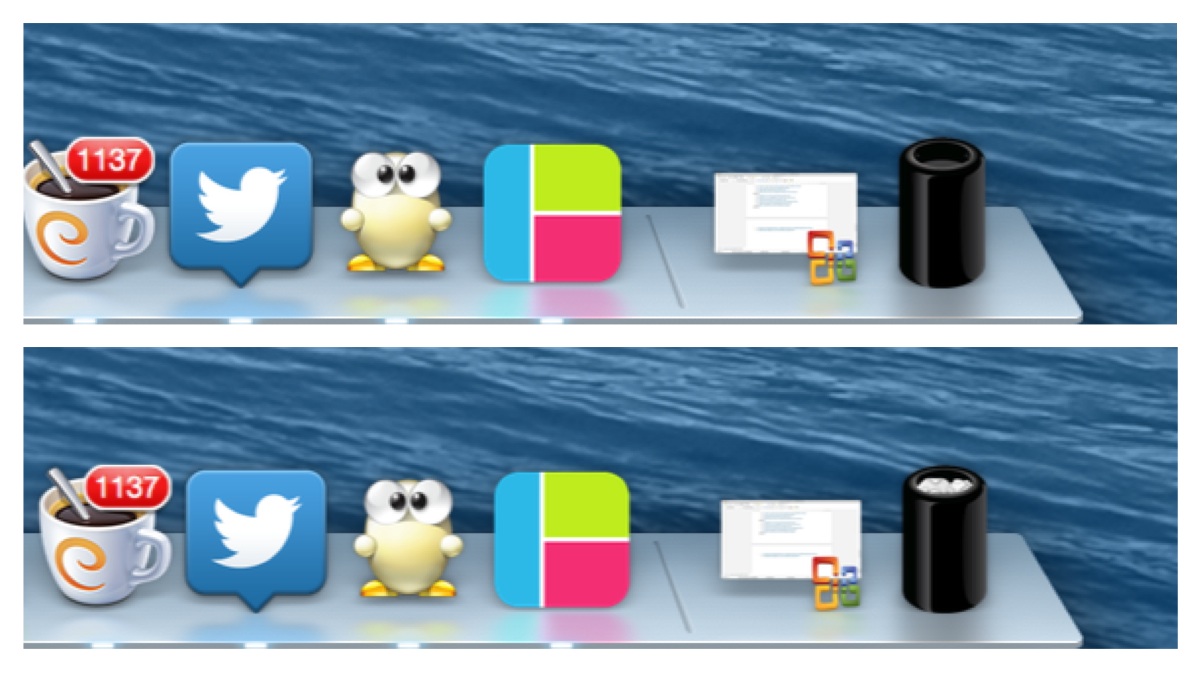 Per prima cosa è necessario scaricare il pacchetto *.zip contenente le nuove icone da sostituire a quelle di default. Fatto ciò, occorre cliccare su Finder e recarsi alla cartella Macintosh -> Sistema -> Libreria -> CoreServices. Successivamente occorre cliccare sulla voce Dock e scegliere Mostra Contenuto Pacchetto. A questo punto è necessario rimuovere gli 8 file che iniziano con la parola “trash”, non senza aver prima fatto un backup, così da poter ripristinare la vecchia visuale in qualsiasi momento. A questo punto è sufficiente inserire nella stessa cartella dalla quale sono stati rimossi gli 8 file trash le nuove icone contenute nel pacchetto *zip scaricato. Le nuove icone sono in tutto quattro, dato che il pacchetto non contiene le ulteriori quattro icone con il riflesso.