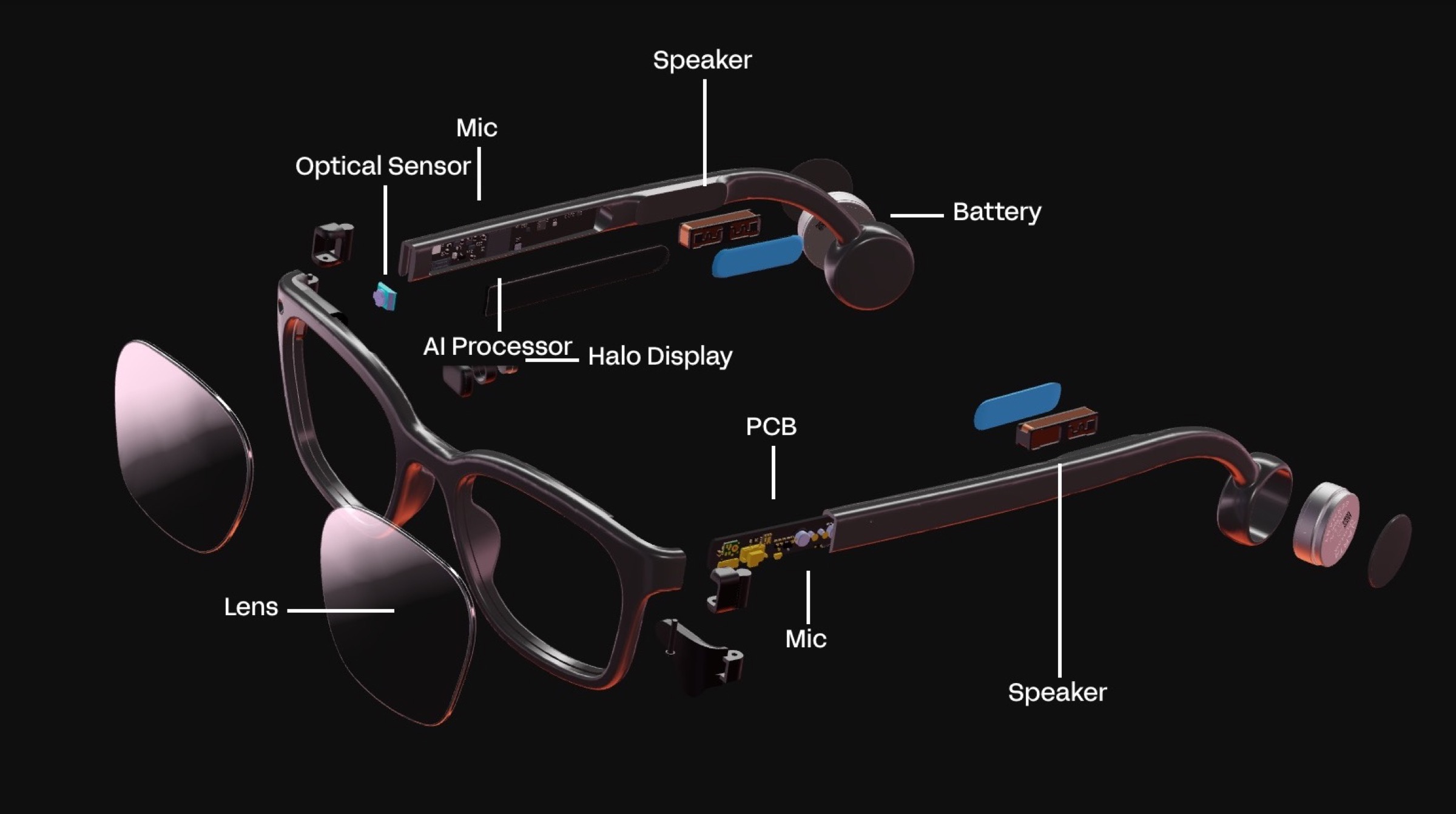 A prima vista, Halo è un paio di occhiali in stile wayfarer, ma al suo interno nasconde una tecnologia da vero assistente AI: microfono, fotocamera, altoparlanti a conduzione ossea, batteria da 14 ore di autonomia e un display OLED a colori. Il tutto in appena 40 grammi di peso.
