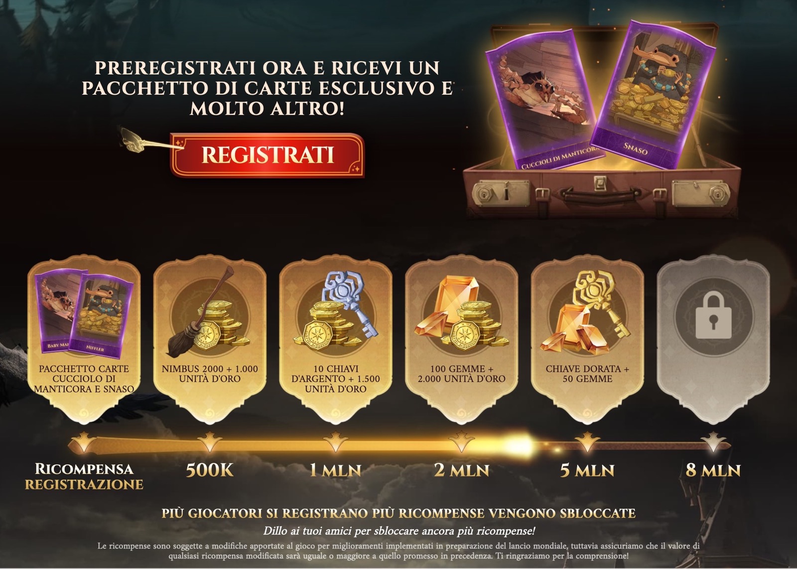 A registrazione ultimata, si avrà la certezza di ricevere un pacchetto di carte aggiuntivo contenente il cucciolo di Manticora e lo Snaso. Si riceveranno anche la Nimbus 2000, 10 chiavi d’argento, 100 gemme e 4.500 unità d’oro in quanto sono già stati abbondantemente superati i due milioni di pre-registrazioni.