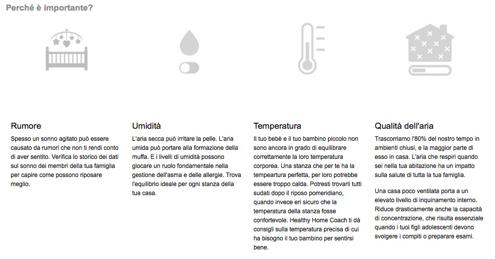 E’ ciò che fa Healthy Home Coach: tiene traccia e registra tutti gli elementi ambientali interni raccogliendo i dati personalizzati dell’ambiente dell’utente e fornisce approfondimenti su misura, attuabili in base alla stagione, l’ora del giorno, le misurazioni o i profili degli utenti.