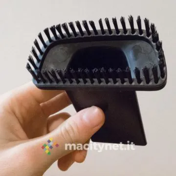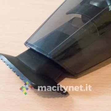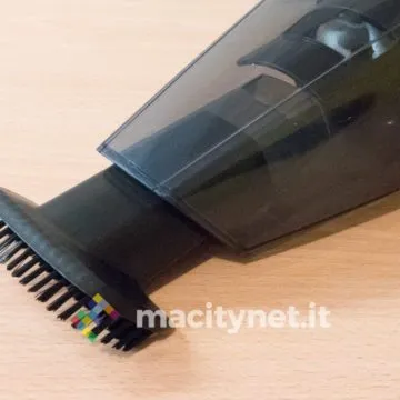 La scatola contiene, oltre all’aspirabriciole, un filtro di ricambio, una spazzolina per la pulizia dei componenti interni, una base per la ricarica della batteria e tre diversi accessori che modificano la bocchetta di aspirazione adattandola a più utilizzi. Tra questi c’è una sorta di prolunga che riduce sensibilmente le dimensioni dell’apertura, con un taglio trasversale di quest’ultima che permette così di infilarla anche negli angoli più remoti della casa; il secondo accessorio è una bocchetta con spazzola annessa, ottima per raccogliere facilmente capelli, peli e sporcizia su superfici delicate come la tappezzeria di un divano; l’ultimo è una bocchetta in gomma con sottili dentini, progettata per la raccolta di liquidi.