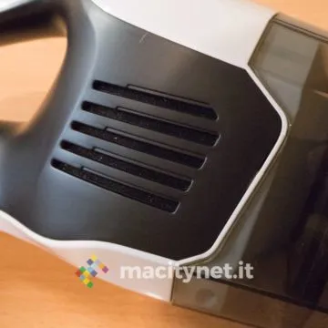 Sul fondo ci sono ampie viti con testa a croce che possono eventualmente essere rimosse per smontare la carcassa principale (operazione che, lo precisiamo, invalida la garanzia) e magari pulire il motore o sostituire le coperture in spugna. Sul lato superiore ci sono invece l’interruttore ON/OFF per l’avvio e l’arresto dell’aspirazione e un pulsante a pressione che permette di sganciare il serbatoio.