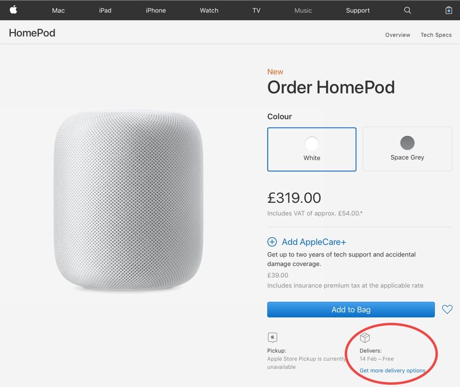 Nelle scorse ore infatti le spedizioni HomePod sono slittate al 12 febbraio in Australia, sia per il modello bianco che nero. Stesso discorso anche in Regno Unito ma con una attesa leggermente più lunga, qui infatti per chi ordina oggi le spedizioni HomePod sono indicate per mercoledì 14 febbraio.