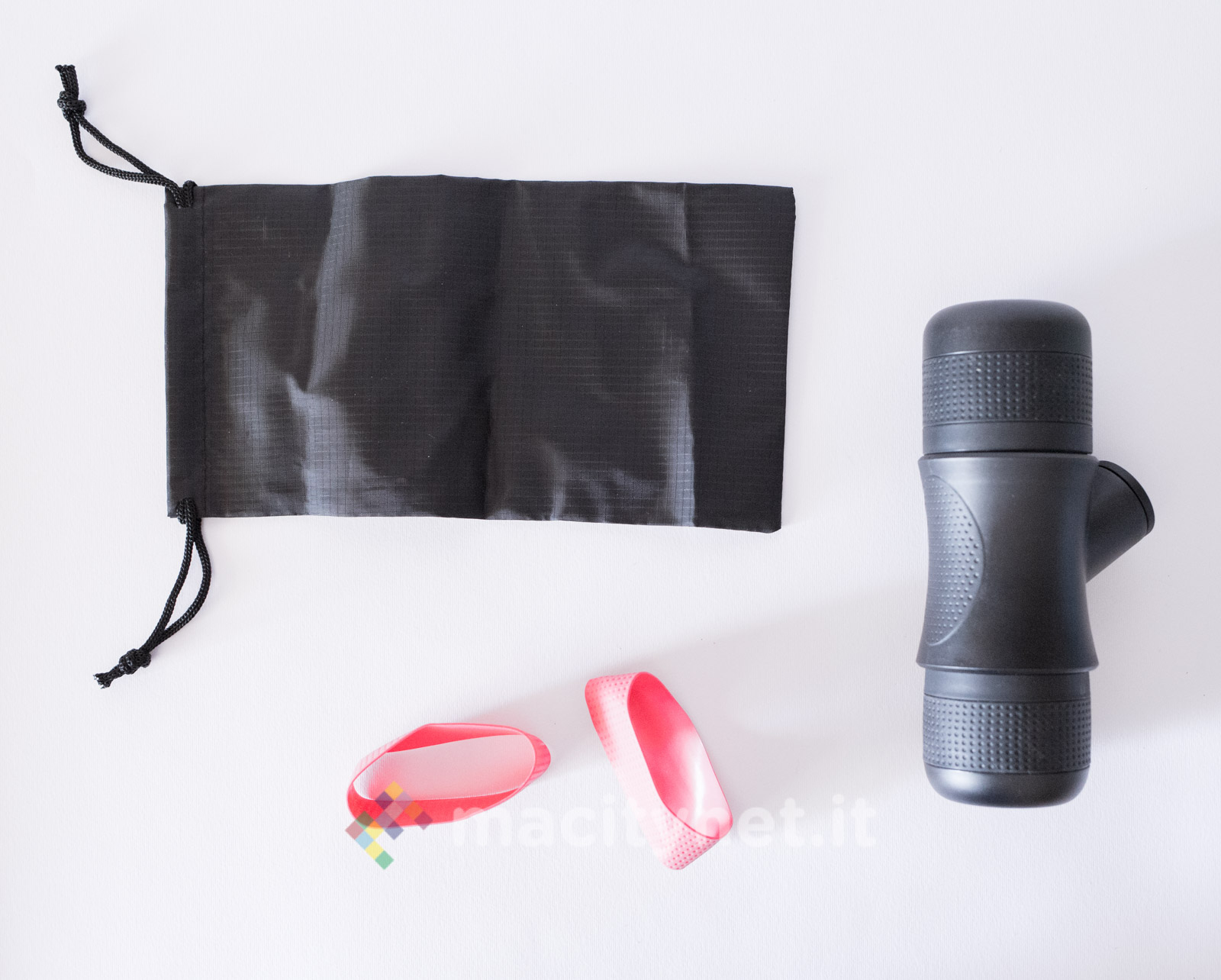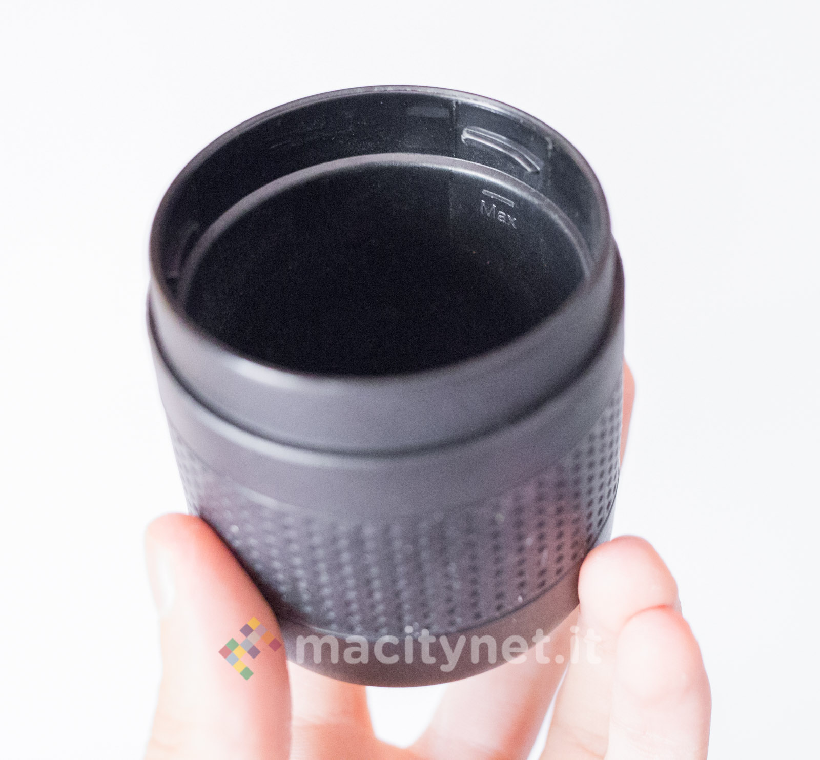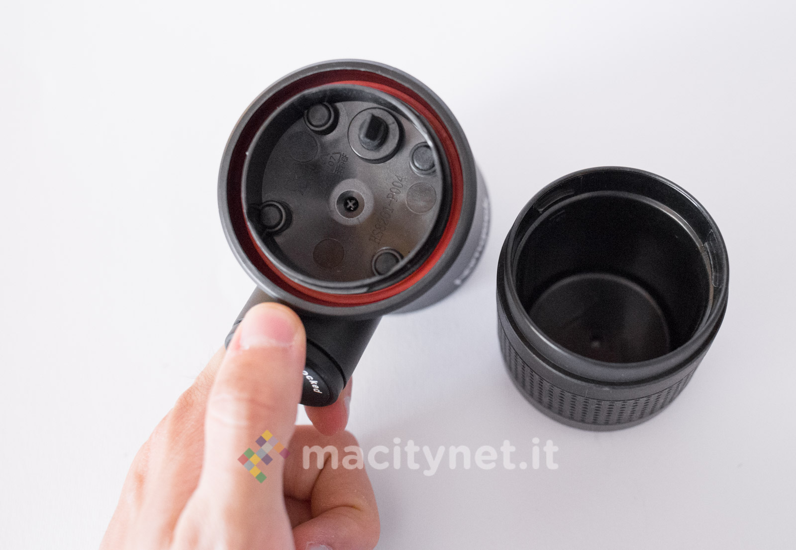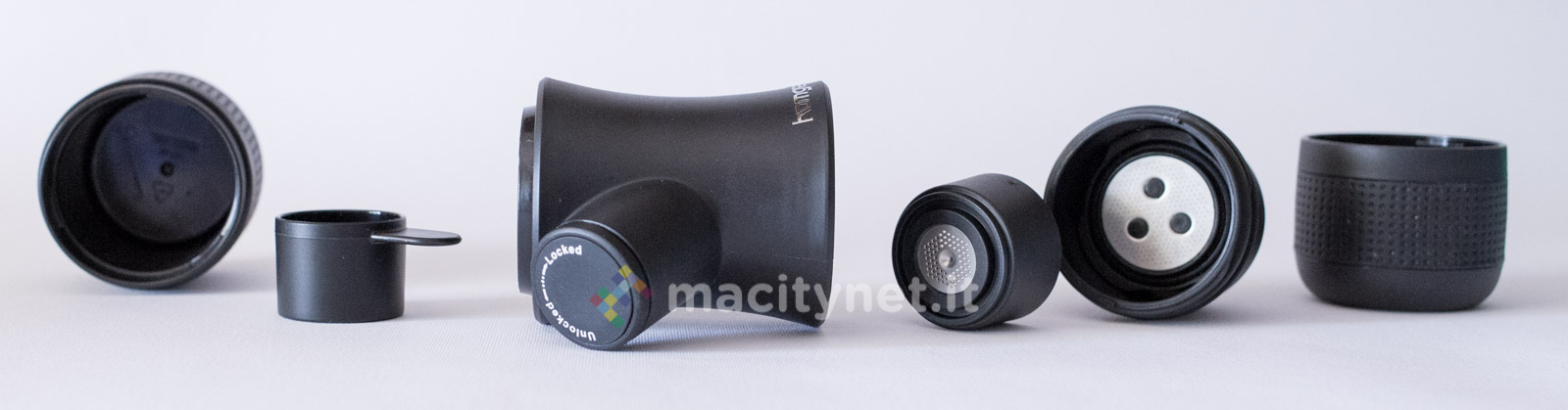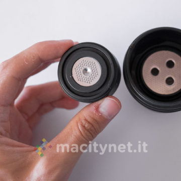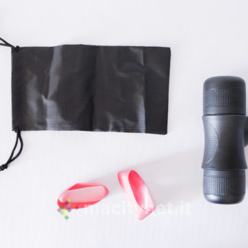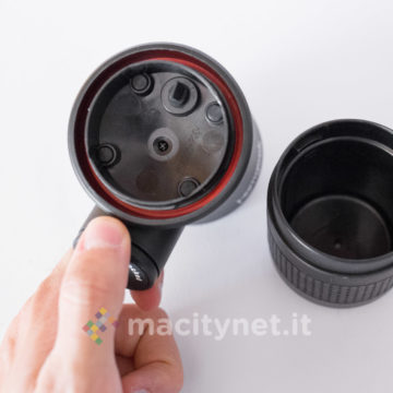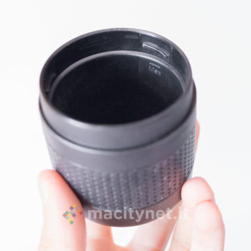 Tutte le parti sono realizzate in plastica molto robusta e, in base alle nostre prove, capace di trattenere perfettamente il calore dell’acqua bollente appena caricata nel serbatoio (come vi spiegheremo più avanti) senza mai scottare quando la si tiene in mano. Il sistema di filtri intero è realizzato con piastre forellate in metallo mentre all’esterno due larghi anelli in gomma migliorano la presa di serbatoio e bicchiere. Nella confezione ce ne sono due intercambiabili di colore rosso: nelle prime prove non li abbiamo usati mentre in viaggio ci è risultato più comodo sostituirne uno dei due con l’anello rosso per riuscire a distinguerli a colpo d’occhio (abbiamo messo il rosso sul bicchiere).