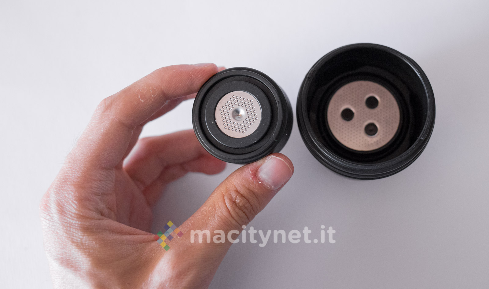 Quest’ultimo si poggia sul relativo lato della pompa, riconoscibile da un piccolo anello sporgente costruito su misura per accogliere il filtro. Sopra di esso si avvita quindi l’estrattore e si capovolge la pompa (nel video eseguiamo rapidamente il procedimento inverso per mostrarvi come il caffè venga leggermente compresso dal sistema).