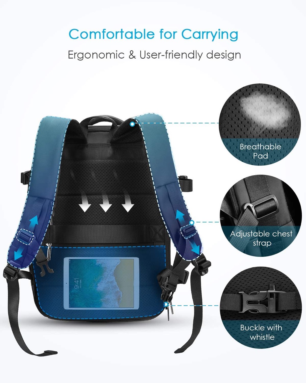 Essendo sia zaino che valigia si può trasportare a mano tramite una maniglia oppure in spalla con la tracolla, o ancora si può poggiare su entrambe le spalle distribuendo il peso su tutto il corpo grazie allo schienale aerodinamico e al cinturino pettorale regolabile, dotato per altro di un comodo taschino porta-oggetti nel quale è possibile mettere la tessera dell’autobus, la chiave della camera d’albergo o magari il fischietto per il primo soccorso.
