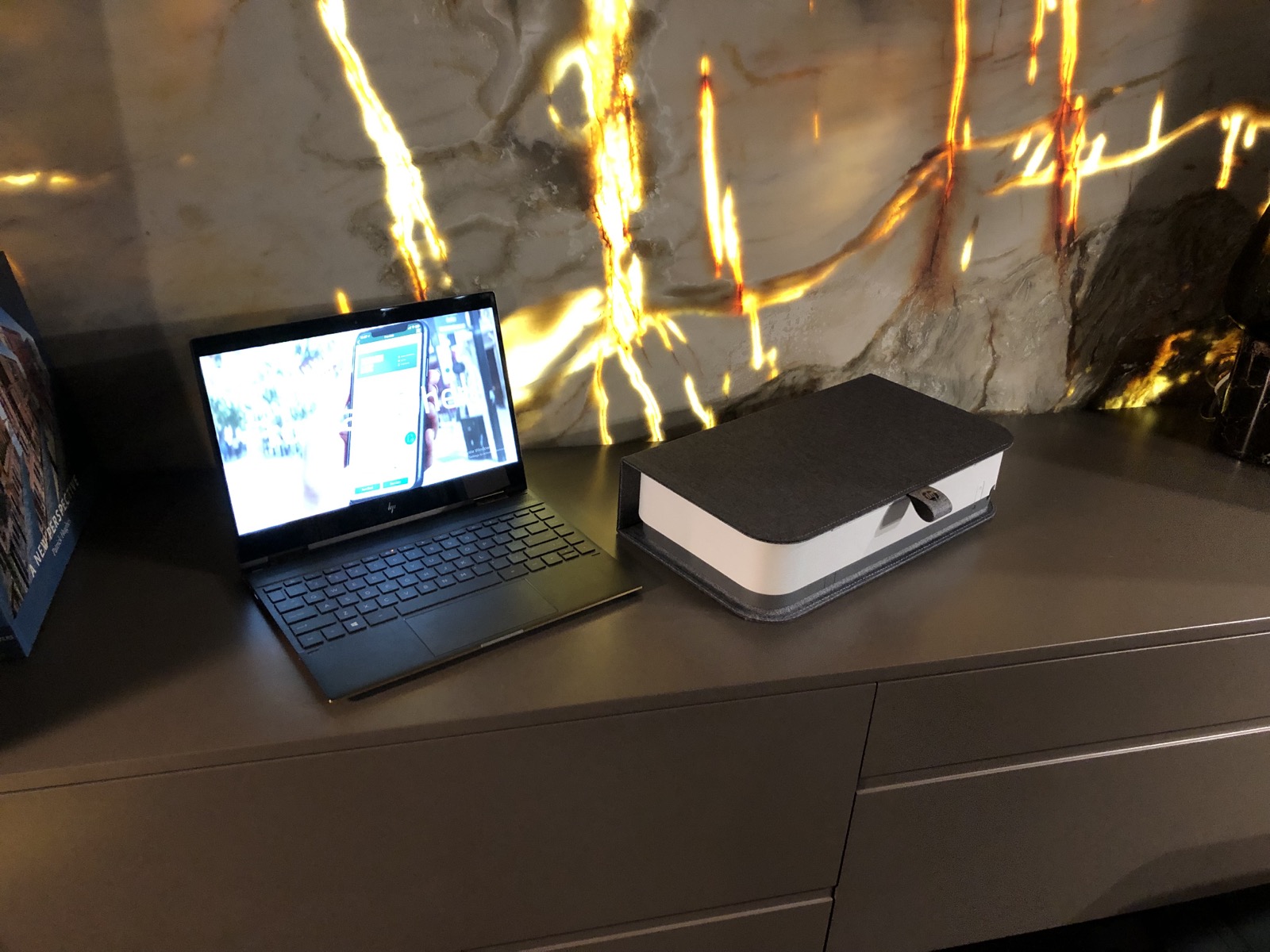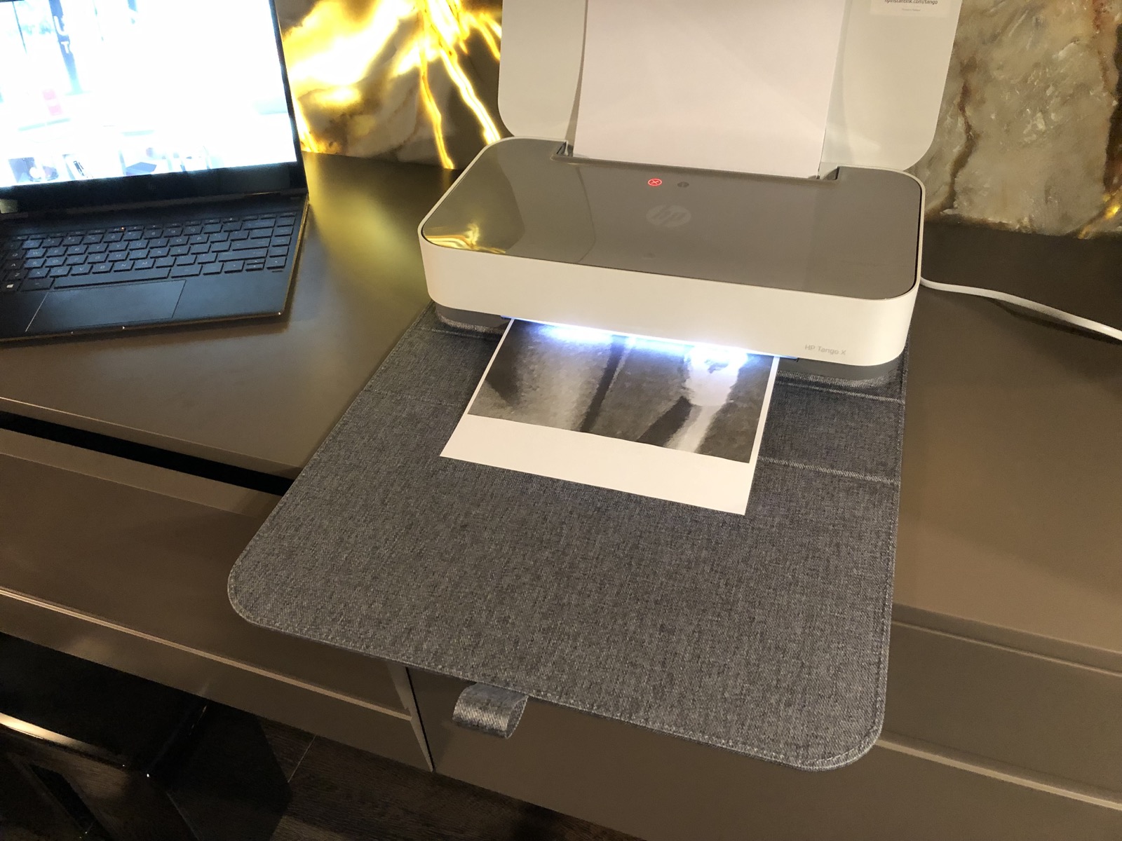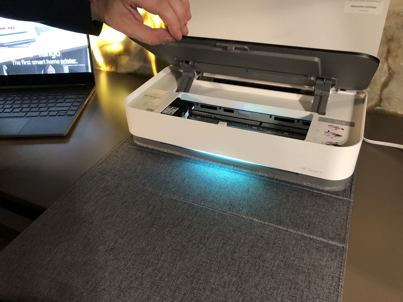 HP presenta Tango, la stampante che arredaUna volta in funzione, Tango mostra una luce a LED che illumina le varie fasi di sincronizzazione e stampa, con la cover che, una volta aperta, funge anche da piatto raccoglifogli.