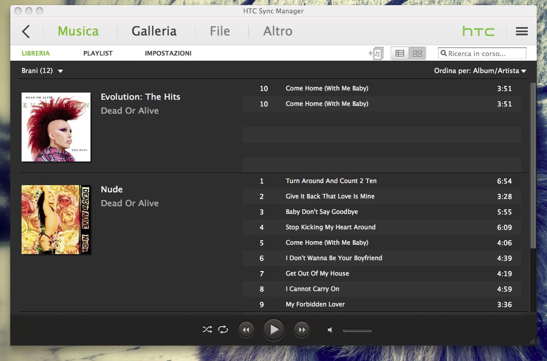 HTC Synch manager è in grado di leggere i backup di iPhone e carpire dunque tutti i dati dallo smartphone della Mela, per poi sincronizzarli sul nuovo dispositivo HTC. Il software fornito dalla società di Taiwan è essenziale: include 4 menù principali – forse un po’ tropo scarni – da cui è possibile interagire con Musica, Galleria, File e Altro.
