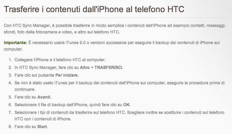 Per chi decidesse di passare da iPhone ad HTC, l’azienda di Taiwan rende tutto più semplice: basterà scaricare l’ultima versione di HTC Sync Manager, l’ultima versione di iTunes e procedere a trasferire tutti i propri dati, file, musica, contatti, messaggi ed ogni contenuto personale da iPhone a HTC One.