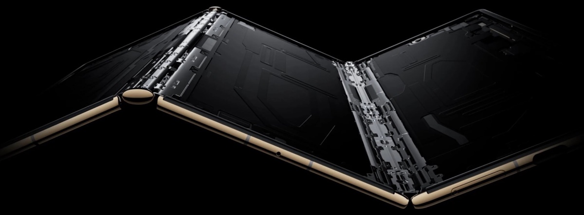 Chiuso è un terminale da 6,4” ma basta aprire una delle tre ante per avere a disposizione lo schermo di un tablet compatto da 7,9”. Con uno chassis a forma di Z, dotato di due cardini di apertura e tre schermi, il terminale completamente aperto mette a disposizione un display da ben 10,2 pollici con risoluzione 3K di 2.232 x 3.184 pixel e un rapporto telaio – schermo del 92%.