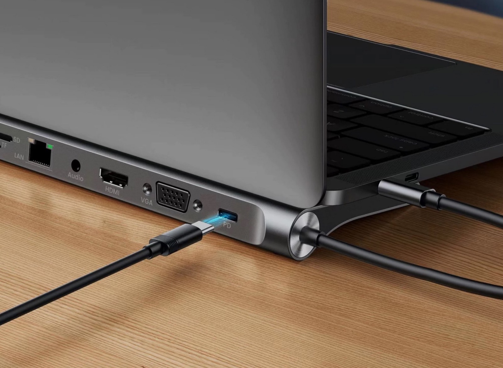 Come dicevamo ce ne sono undici in tutto, a partire dalla USB-C passante con tecnologia Power Delivery che permette di ricaricare qualsiasi computer portatile attraverso lo stesso hub, che è in grado di gestire una potenza massima di 87 Watt.