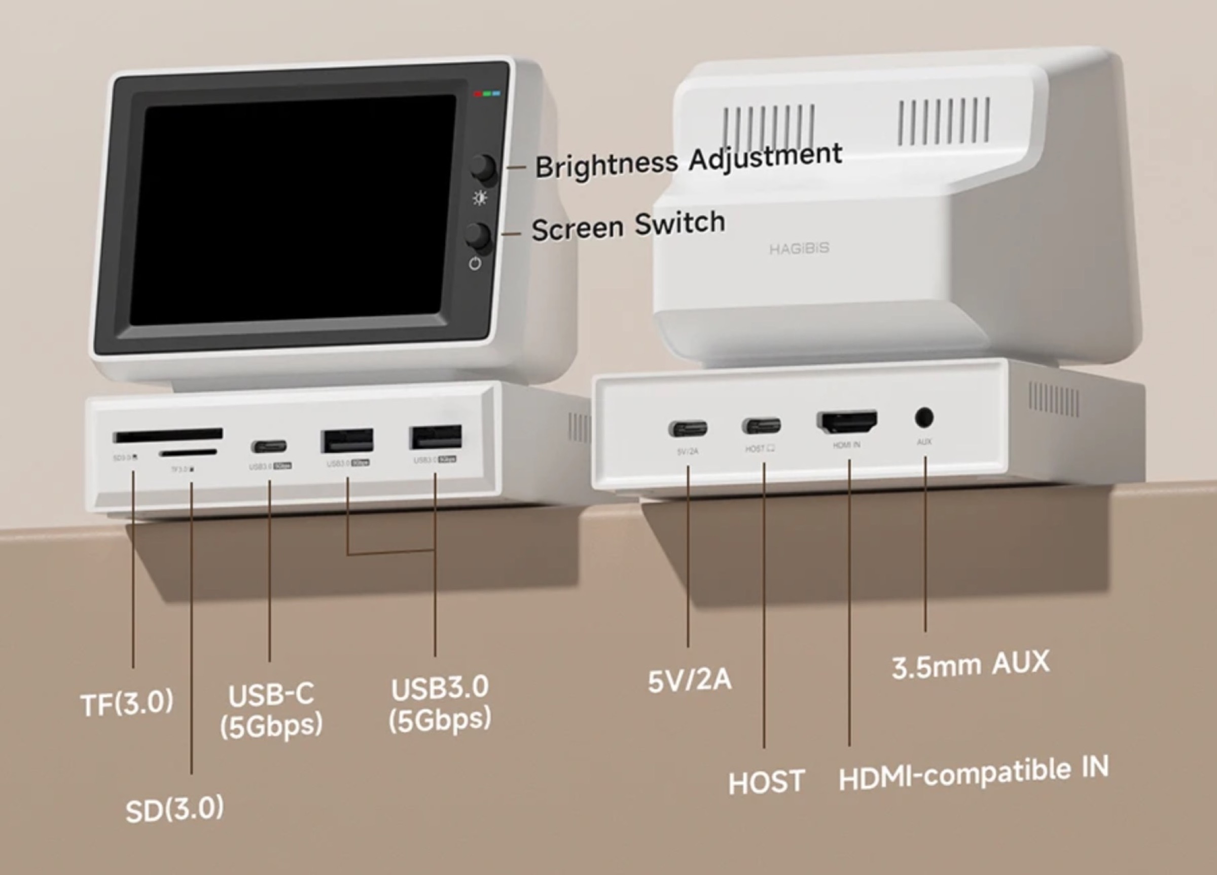 Oltre ad espandere le porte del computer è infatti dotato di uno schermo (è da pannello IPS da 3,5 pollici con risoluzione Full HD in 3:2) attraverso cui estendere una parte delle azioni che normalmente si svolgono sul computer collegato.