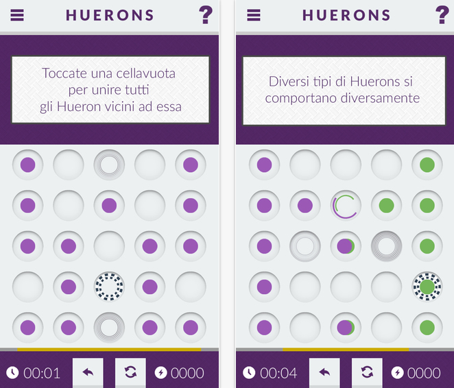Huerons è il nuovo rompicapo di di Bulkypix ad approdare in App Store. Il gioco prende il nome dagli Hueron, piccoli cerchi colorati presenti su una vasta scacchiera, da unire fino a farne rimanere soltanto uno. Cliccando sulle caselle vuote, gli Huerons adiacenti si uniranno in un unico corpo. In questo modo il puzzle viene risolto quando rimane un solo Hueron sulla scacchiera.