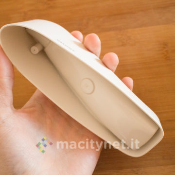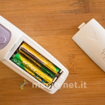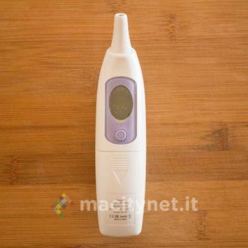 Nello specifico è un termometro da orecchio che fa uso di tecnologia ad infrarosso. E’ realizzato in ABS, molto robusto (senza batterie pesa 57 grammi) e, come spiegato poc’anzi, viene venduto insieme ad una base che protegge la sonda e permette di appoggiarlo agevolmente su un tavolo, avendolo così a portata di mano ad esempio durante il periodo di influenza. Nella confezione è inclusa anche una sacca in tessuto per riporlo durante i lunghi periodi di inutilizzo. Funziona con due batterie ministilo AAA (in dotazione) che vanno inserite rimuovendo lo sportellino anteriore facendo leva sull’apposita scanalatura.
