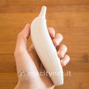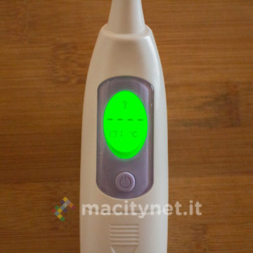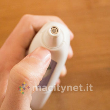 La forma è tale da renderlo davvero maneggevole, mentre per il funzionamento sono presenti due pulsanti: uno, frontale per l’accensione e lo spegnimento del termometro, l’altro, sul lato opposto, è dedicato all’avvio della misurazione della temperatura. C’è infine un display LCD integrato sul dorso accompagnato da una gradevole retroilluminazione verde che mostra la misurazione effettuata insieme alle ultime 10 mantenute in memoria. In caso di temperatura compresa tra i 37.4°C e i 38°C la luce diventa arancione, mentre sopra i 38.1°C sarà rossa.