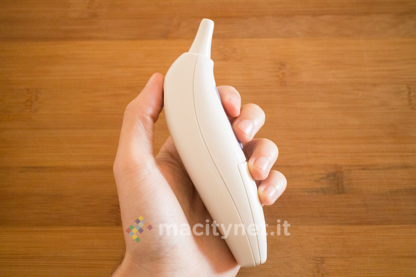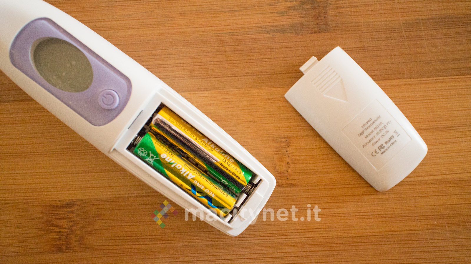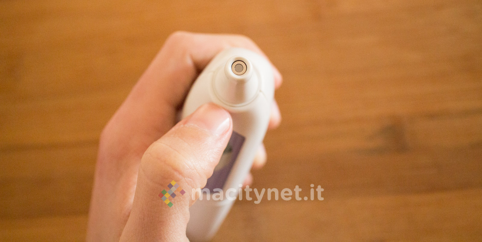 La forma è tale da renderlo davvero maneggevole, mentre per il funzionamento sono presenti due pulsanti: uno, frontale per l’accensione e lo spegnimento del termometro, l’altro, sul lato opposto, è dedicato all’avvio della misurazione della temperatura. C’è infine un display LCD integrato sul dorso accompagnato da una gradevole retroilluminazione verde che mostra la misurazione effettuata insieme alle ultime 10 mantenute in memoria. In caso di temperatura compresa tra i 37.4°C e i 38°C la luce diventa arancione, mentre sopra i 38.1°C sarà rossa.