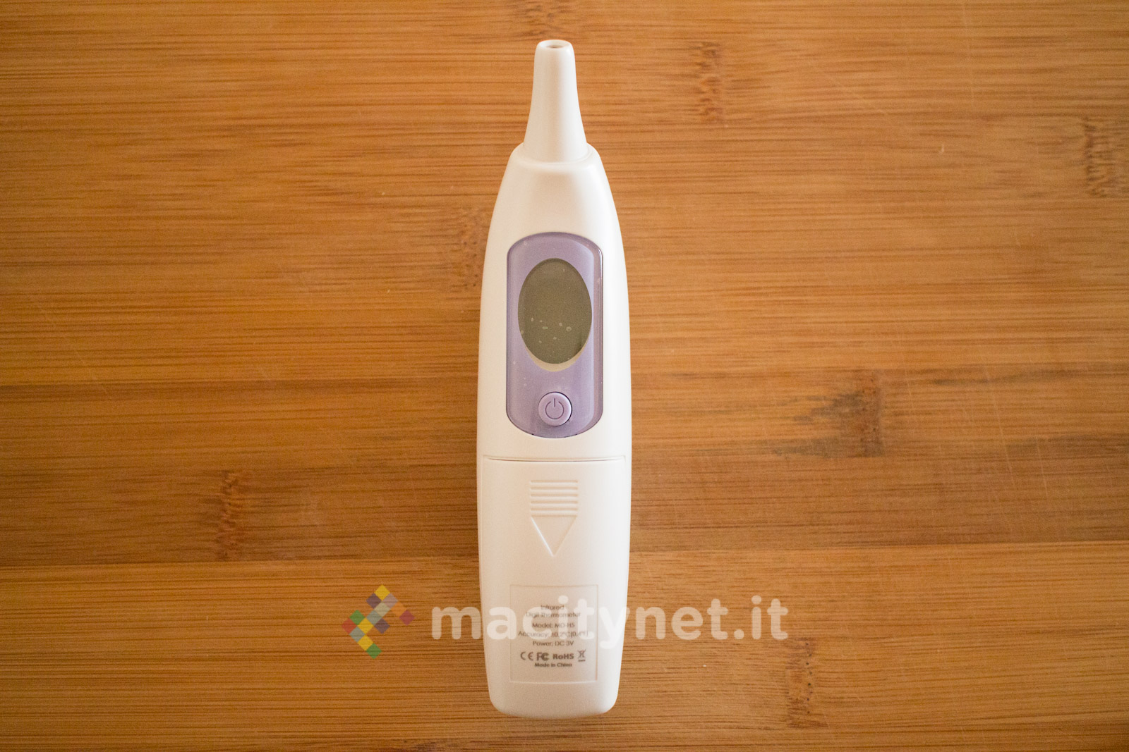 Nello specifico è un termometro da orecchio che fa uso di tecnologia ad infrarosso. E’ realizzato in ABS, molto robusto (senza batterie pesa 57 grammi) e, come spiegato poc’anzi, viene venduto insieme ad una base che protegge la sonda e permette di appoggiarlo agevolmente su un tavolo, avendolo così a portata di mano ad esempio durante il periodo di influenza. Nella confezione è inclusa anche una sacca in tessuto per riporlo durante i lunghi periodi di inutilizzo. Funziona con due batterie ministilo AAA (in dotazione) che vanno inserite rimuovendo lo sportellino anteriore facendo leva sull’apposita scanalatura.