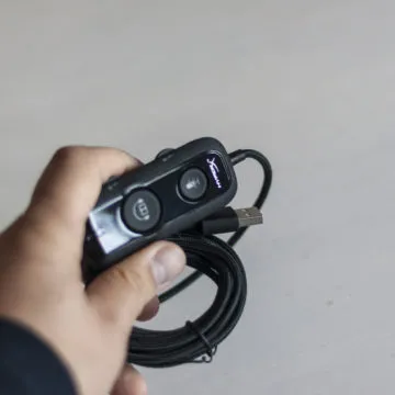 La scheda audio, che offre anche una comoda clip per essere agganciata ai vestiti, mostra due pulsanti centrali, uno per l’accensione del chip vero e proprio e uno per il mute del microfono, più due regolazioni analogiche del volume di entrata e del volume del microfono.