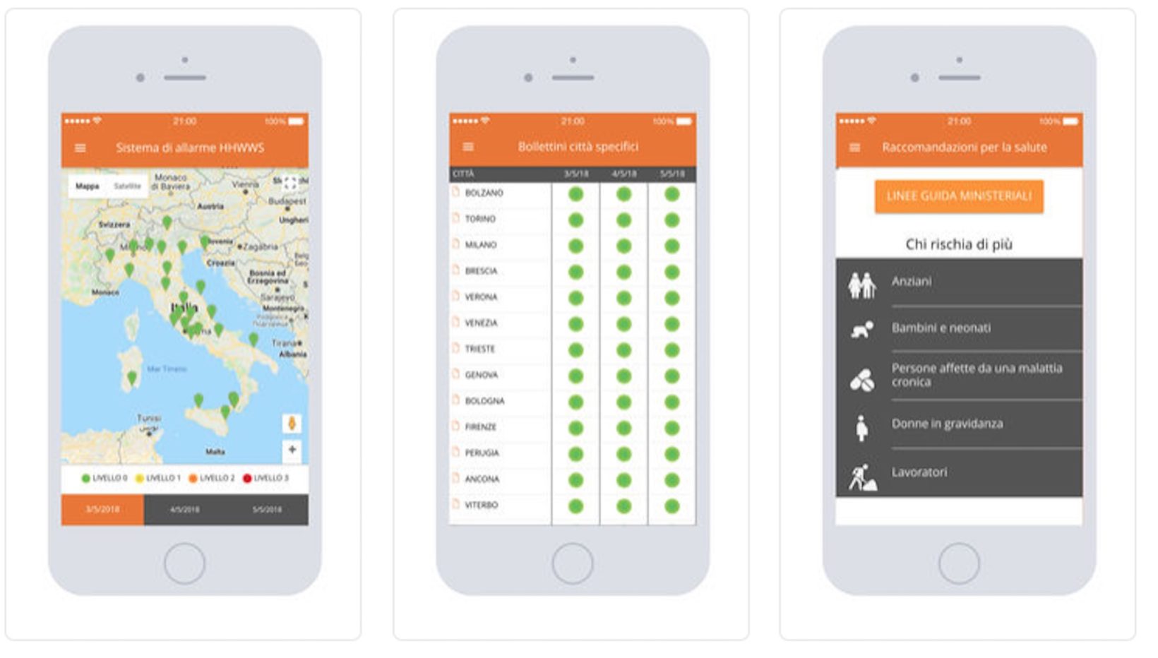 L’app, realizzata dal Ministero della Salute e dal Dipartimento di epidemiologia del servizio sanitario della Regione Lazio – ASL Roma 1, offre in particolare uno sguardo sui livelli di rischio per la salute in ogni città per i tre giorni in cui viene sviluppata la previsione delle ondate di calore. Lo fa attraverso una mappa e una sintesi grafica dei bollettini di facile consultazione dai dispositivi portatili.