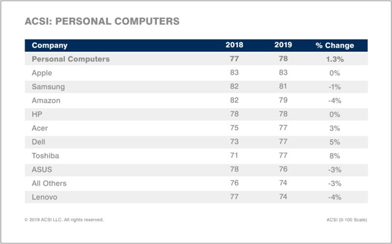 Quest’anno Apple ha ottenuto un punteggio ACSI di 83, lo steso del 2018. L’indice di soddisfazione generale è superiore rispetto a Samsung (che ha ottenuto un punteggio di 81), Amazon (punteggio di 79), HP (78), Acer (77) e altri marchi ancora.