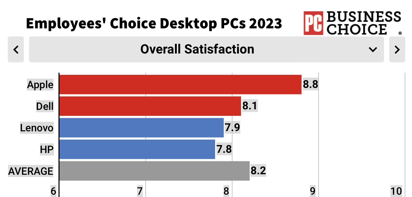 Tutti i Mac desktop, dal Mac mini al all-in-one iMac, sono macchine molto amate negli ambienti lavorativi e Apple ottiene punteggi elevati in termini di “facilità d’uso e affidabilità”. La Casa di Cupertino ha ottenuto punteggi alti anche per quanto riguarda il supporto e il servizio di riparazione.