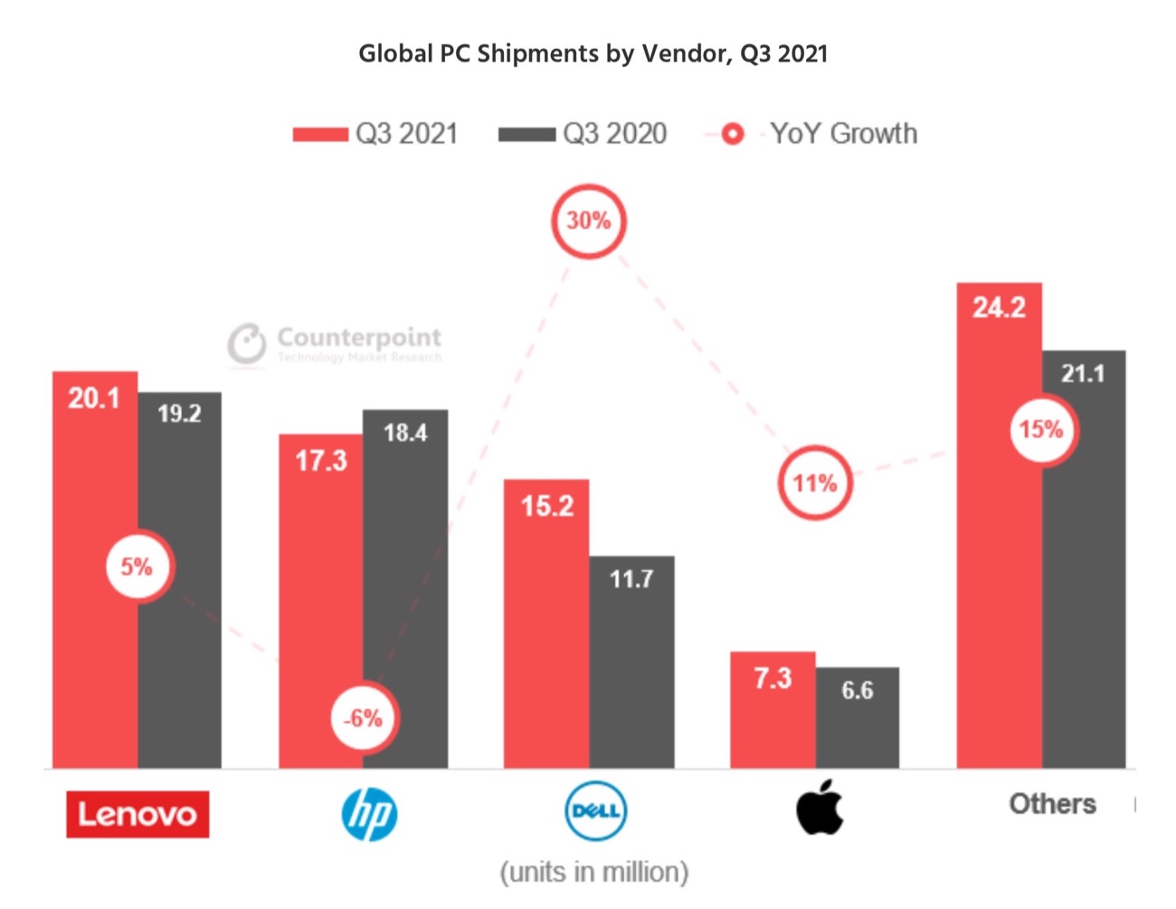 Secondo i dati di Counterpoint Research, le spedizioni di PC in tutto il mondo continuano a crescere, come d’altronde è stato negli ultimi sei trimestri a questa parte. Nel periodo che va da luglio a settembre, i numeri ci dicono che in totale sono stati spediti 84,2 milioni di PC, una cifra che è superiore del 9,3% rispetto a quella registrata lo scorso anno nello stesso periodo.