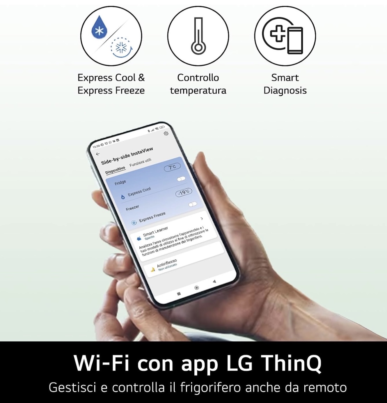 Caratteristiche smart: la connettività Wi-Fi (ecosistema LG) abilita controllo temperatura, notifiche e gestione più semplice anche da fuori casa. Lato smart, il vantaggio è la combinazione tra app e InstaView: meno sprechi, più consapevolezza, più controllo senza dover “toccare” sempre il frigo.