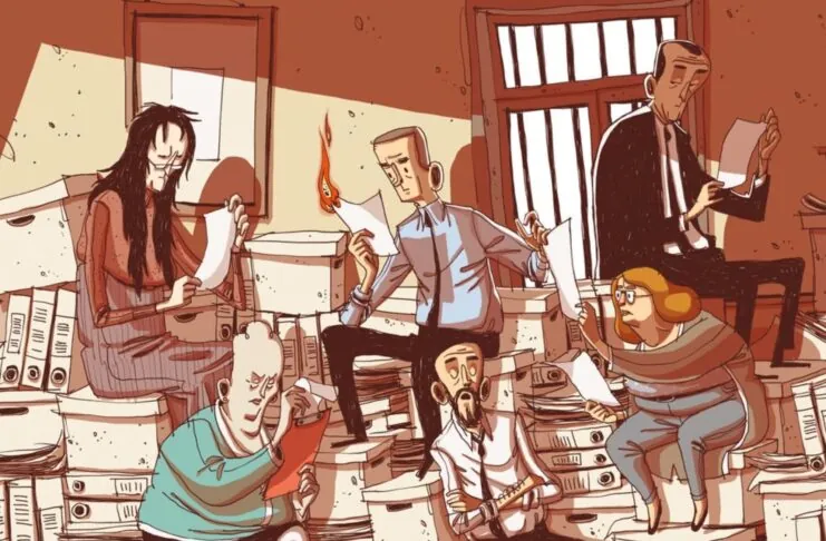 Daniel Cuello ha iniziato il suo percorso narrativo di graphic novel sulla contemporaneità con Residenza Arcadia e Mercedes. Questa è una storia che è ambientata nello stesso mondo ed è “accanto” ma non necessariamente dopo le due precedenti. Un ufficio pieno di semplici impiegati – il volto meno terribile ma comunque insidioso di una dittatura – è il contesto in cui si svolge la storia. Perso nei corridoi di un vetusto edificio della Pubblica Amministrazione, c’è l’Ufficio 84. I suoi impiegati si occupano di assicurarsi che qualunque scritto generato nella nazione non possa turbare la serenità del Partito. Dai testi delle canzoni alle bozze dei romanzi, dai giornalini parrocchiali ai testi tecnici e scolastici, tutto passa per le loro mani, affinché si attenga alle regole di un mitico Vademecum, che nessuno fa a tempo a leggere prima che venga aggiornato, diventando sempre più censorio e limitante. Tra il giorno in cui inizia questa storia e il giorno in cui finisce, trascorrono ventidue anni. Nello sguardo di Teo Salsola, il direttore dell’Ufficio 84, li vedrete tutti, quegli anni, e tutti quelli venuti prima. Persosi nel concetto stesso di burocrazia per non essere riuscito mai a immaginarsi realmente un ribelle, il Direttore Salsola anestetizza i propri giorni nella speranza di non ritrovarsi mai. Ovviamente fallirà, e quando si ritroverà nulla sarà più lo stesso, e le conseguenze della sua presa di coscienza saranno epocali, non solo per lui.