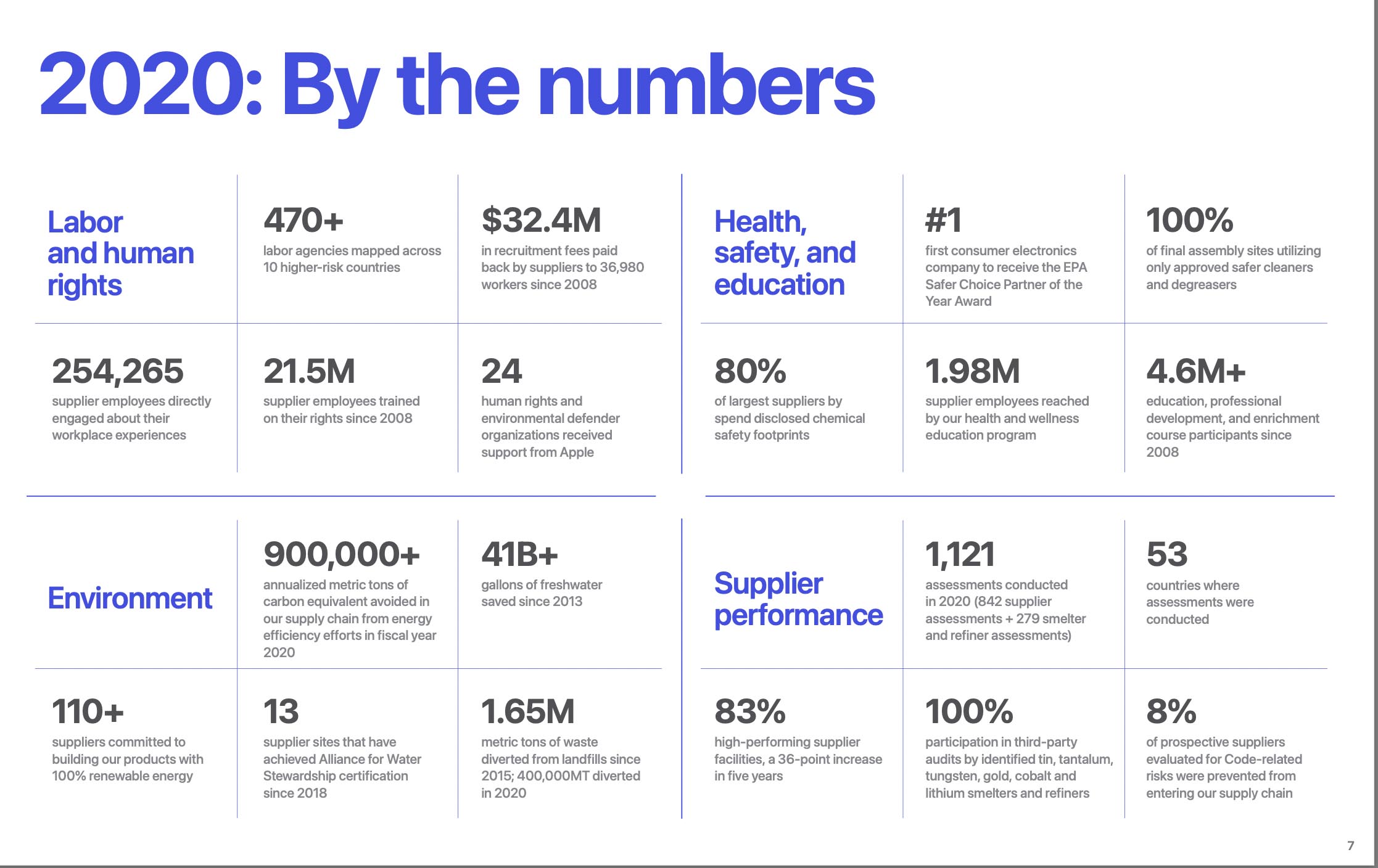 Il report parte evidenziando dati in diversi ambiti: lavoro e diritti umani, salute, sicurezza e istruzione, ambiente, evidenziando le performance dei fornitori rispetto allo scorso anno. Apple ha ad esempio identificato 470 agenzie del lavoro in dieci paesi indicate come ad alto rischio per il lavoro e le violazioni dei diritti umani. Sono stati intervistati oltre 250.000 dipendenti che lavorano negli stabilimenti dei fornitori per avere dati sulla loro esperienza lavorativa, una frazione dei milioni di operai che, si stima, lavorano per partner quali Foxconn.