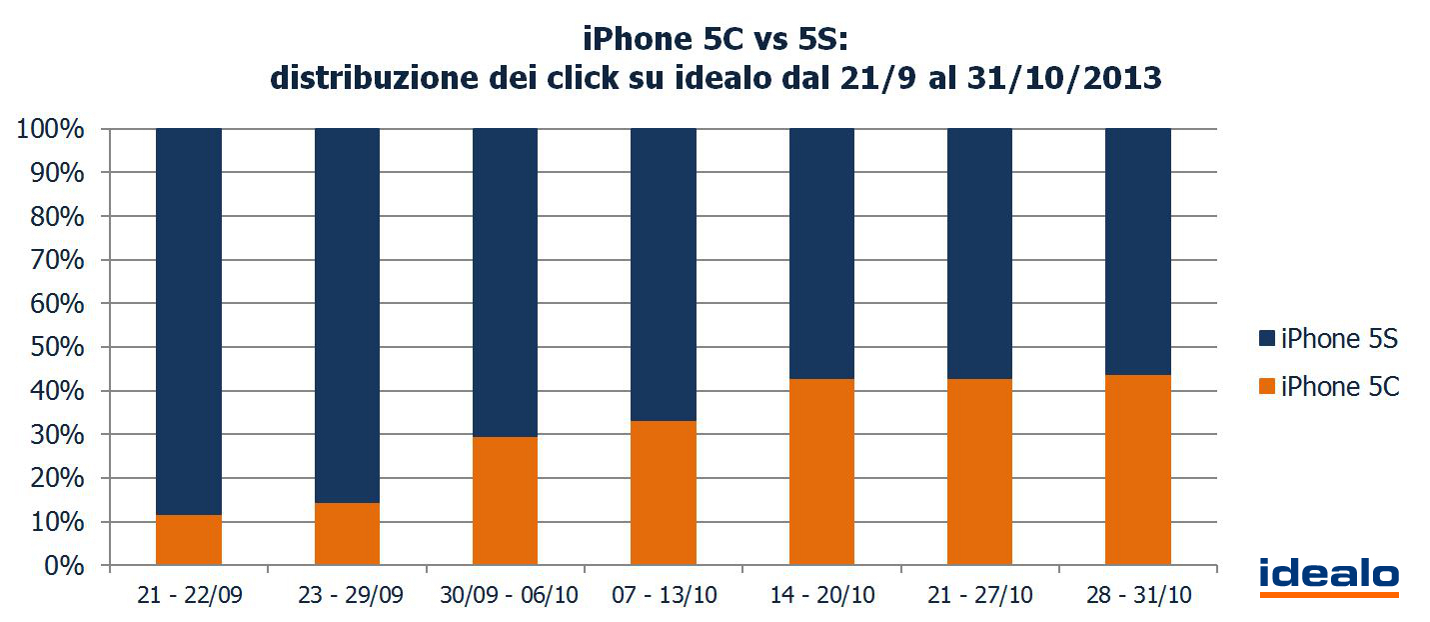 Per la prima volta, sottolinea questo aggregatore di rivenditori online, il prezzo di un prodotto Apple ha registrato una significativa riduzione di prezzo nel breve periodo dopo la sua introduzione sul mercato. Il prezzo dell’iPhone 5c, da metà settembre fino alla fine del mese di ottobre 2013, ha subito una flessione del 25%. Solo a seguito dei forti sconti applicati dai rivenditori su iPhone 5c, la domanda per questo modello di iPhone inizia lentamente ad aumentare e in coincidenza del calo dei prezzi la domanda di iPhone 5c ha iniziato ad aumentare dal 12% al 44%.