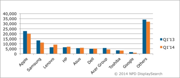 Per quanto riguarda le spedizioni globali di tablet si è passati dai 59 milioni di pezzi del primo trimestre del 2013 ai 56,3 milioni di unità dei primi tre mesi di quest’anno. Apple ha spedito 16,3 milioni di iPad, contro i 19,4 milioni del 2013, mentre Samsung ha spedito 9,9 milioni di unità.