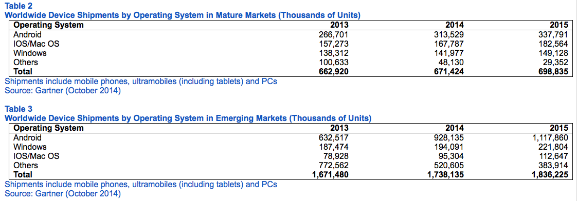 Nel campo degli smartphone sempre quest’anno si registrerà una crescita del 52% per lo più dai terminali Android di fascia media e quella bassa, con una impennata dei modelli proposti dai costruttori cinesi a basso prezzo. Con questo andamento Roberta Cozza, direttore ricerche di Gartner prevede che su 10 telefoni venduti 9 saranno smartphone entro il 2018. Le piattaforme dominanti in campo mobile rimangono Android e iOS che consolidano la propria posizione, lasciando percentuali trascurabili per gli altri concorrenti. Grazie alla domanda di smartphone economici dei paesi emergenti si prevede un boom di smartphone Android per il 2015 che supereranno il miliardo di unità.