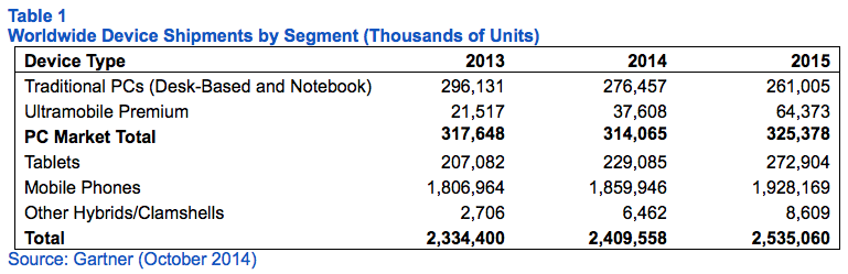 Nel 2014 i tablet rallentano: cambiano le scelte di acquisto degli utenti che portano a mix ancora più complessi tra i form factor principali: si prolunga la vita utile dei tablet e quelli vecchi vengono sostituiti con ultra portatili o dispositivi 2 in 1. Su tutti vincono ancora gli smartphone che entro quest’anno rappresenteranno ben il 71% di tutti i dispositivi monitorati.