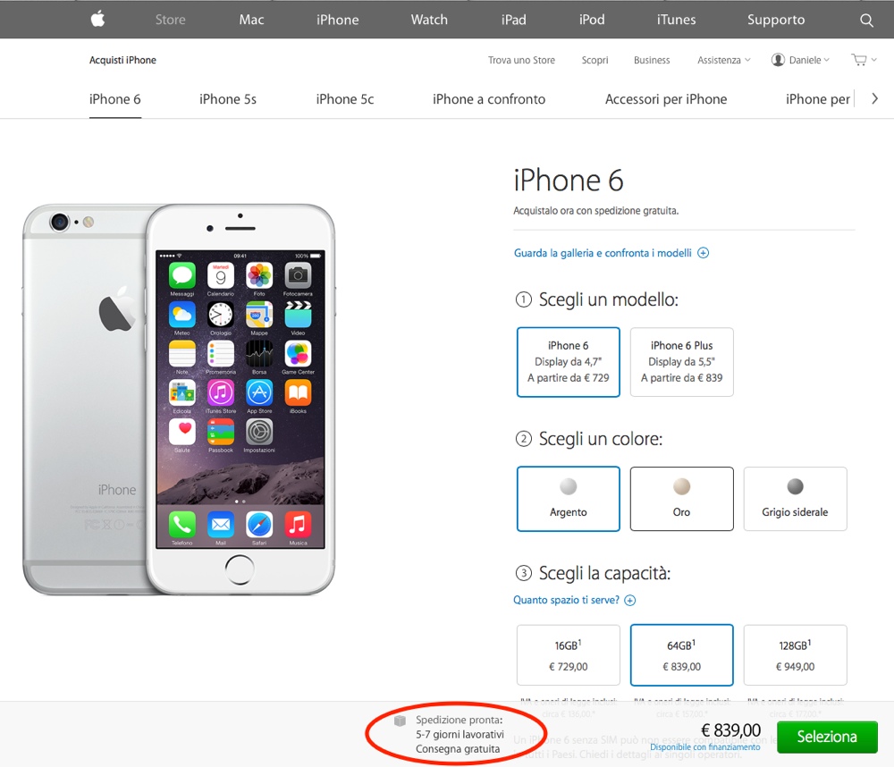 Per quanto riguarda i tempi di spedizione iPhone 6 in Italia per l’acquisto su Apple Store online sembra che le tempistiche siano destinate a rimanere tali almeno per qualche giorno, risultano infatti molto simili a quelle di altri paesi principali di lancio. Per esempio in USA, Regno Unito e anche in Francia i tempi di spedizione iPhone 6 sono di 7-10 giorni per il 4,7”, quindi leggermente superiori rispetto al nostro Paese, mentre risultano identici a 3-4 settimane per il Plus. Se la domanda di iPhone 6 in Italia seguirà quella già emersa nei primi paesi di lancio, è molto probabile che i tempi di spedizione iPhone 6 aumenteranno leggermente per il modello da 4,7”.