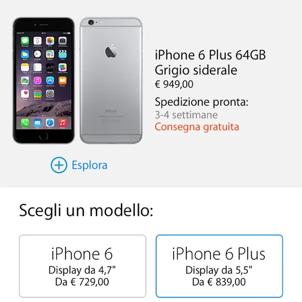 Diverso invece il discorso per il modello phablet: i tempi di spedizione iPhone 6 Plus infatti erano inizialmente a 5-7 giorni ma nelle ultime ore sono slittati sensibilmente fino ad arrivare ad una attesa che va da 3 fino a ben 4 settimane. In pratica chi ha mancato la vendita iniziale nei negozi ed ora desidera acquistare il primo phablet di Apple deve prepararsi a pazientare fino a un mese.