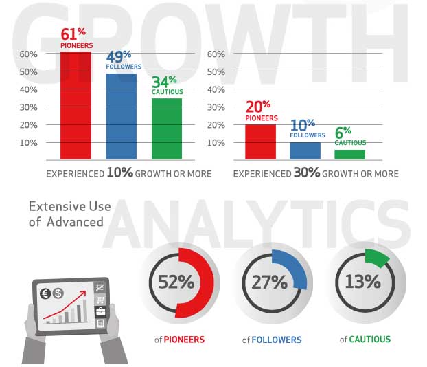 “The Digital Dividend – First Mover Advantage” – questo il titolo del report – evidenzia infatti che i “pionieri” dell’Information Technology sono più avanti rispetto ai loro concorrenti in termini di crescita del fatturato e posizione sul mercato. Il 20% di queste aziende ha registrato una crescita del fatturato superiore al 30%: oltre il doppio rispetto alle aziende identificate dallo studio come “follower” (quelle che restano a guardare e investono solo dopo che i vantaggi sono stati comprovati) e il triplo delle aziende “prudenti” (quelle che aspettano fino a che una tecnologia non sia del tutto consolidata).