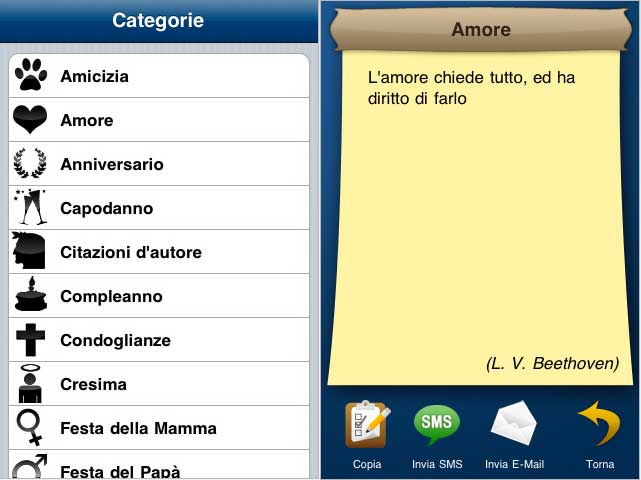 L’applicazione, frutto del lavoro di Luca Cinque (costo 79 centesimi) vi viene in aiuto proprio nelle situazioni più disparate: amicizia, amore, capodanno, condoglianze, feste dei famigliari come festa della mamma e del papà  e compleanni, onomastici. Non manca una sezione dedicata alle citazioni d’autore.