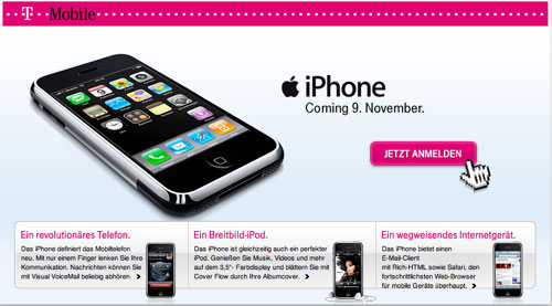 Le notizie che giungono dalla sede di Deutsche Telekom a Berlino confermano quando si poteva prevedere. Il cellulare sarà commerializzato da T-Mobile ad un prezzo di 399 euro, la data di lancio sarà il 9 novembre, la stessa data fissata per l’iPhone della Gran Bretagna.