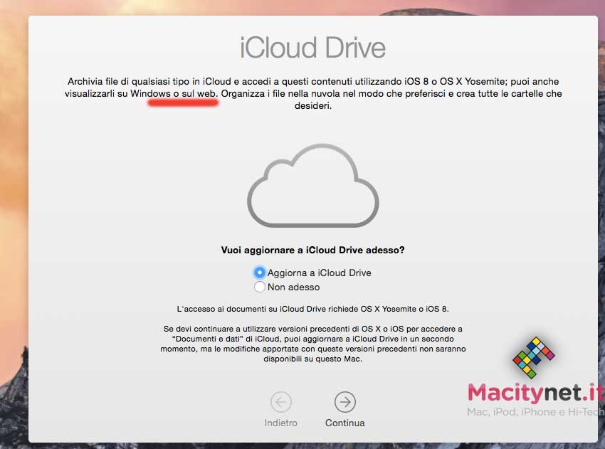 Dalla beta 3 di iOS 8 si apprende che iCloud Drive, il sistema di archiviazione cloud che vedremo integrato anche in OS X 10.10 Yosemite, sarà accessibile dal web. Nella schermata di configurazione si fa esplicito riferimento al web e dunque, probabilmente sulla falsariga di quanto è possibile fare con servizi analoghi, potremo accedere ai file sul cloud dal web con il vantaggio di poterlo fare in qualunque luogo senza la necessità di installare client dedicati.