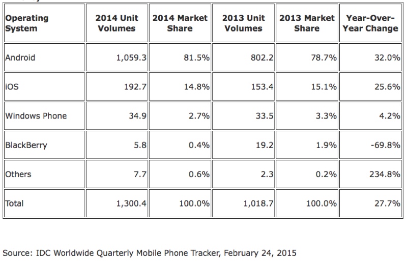 Android e iOS continuano a dominare il mercato degli smartphone. Nei dati IDC relativi all’ultimo trimestre del 2014 e all’intero anno da poco terminato Android e iOS insieme rappresentano il 96,3% del mercato, confermando così una sorta di duopolio per questo settore strategico dell’elettronica di consumo e non solo.